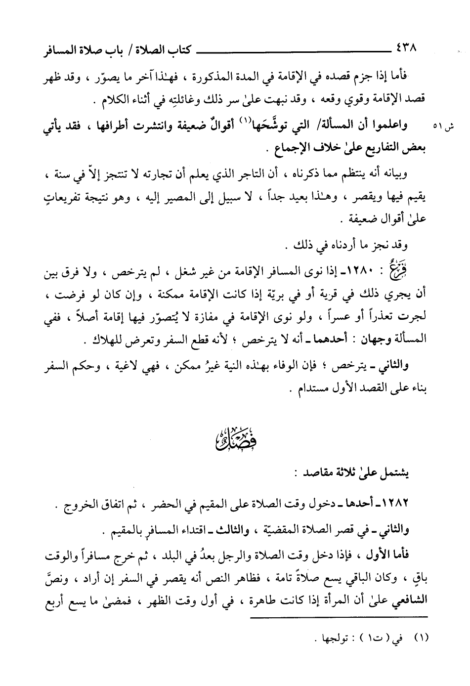 1280 - إذا نوى المسافر الإقامة من غير شغل، لم يترخص، ولا فرق بين أن يجري ذلك في قرية أو في بريّة إذا كانت الإقامة ممكنة، وإن كان لو فرضت، لجرت تعذراً أو عسراً، ولو نوى الإقامة في مفازة لا يتصوّر فيها إقامة أصلاً، ففي المسألة وجهان: أحدهما - أنه لا يترخص؛ لأنه قطع السفر وتعرض للهلاك.