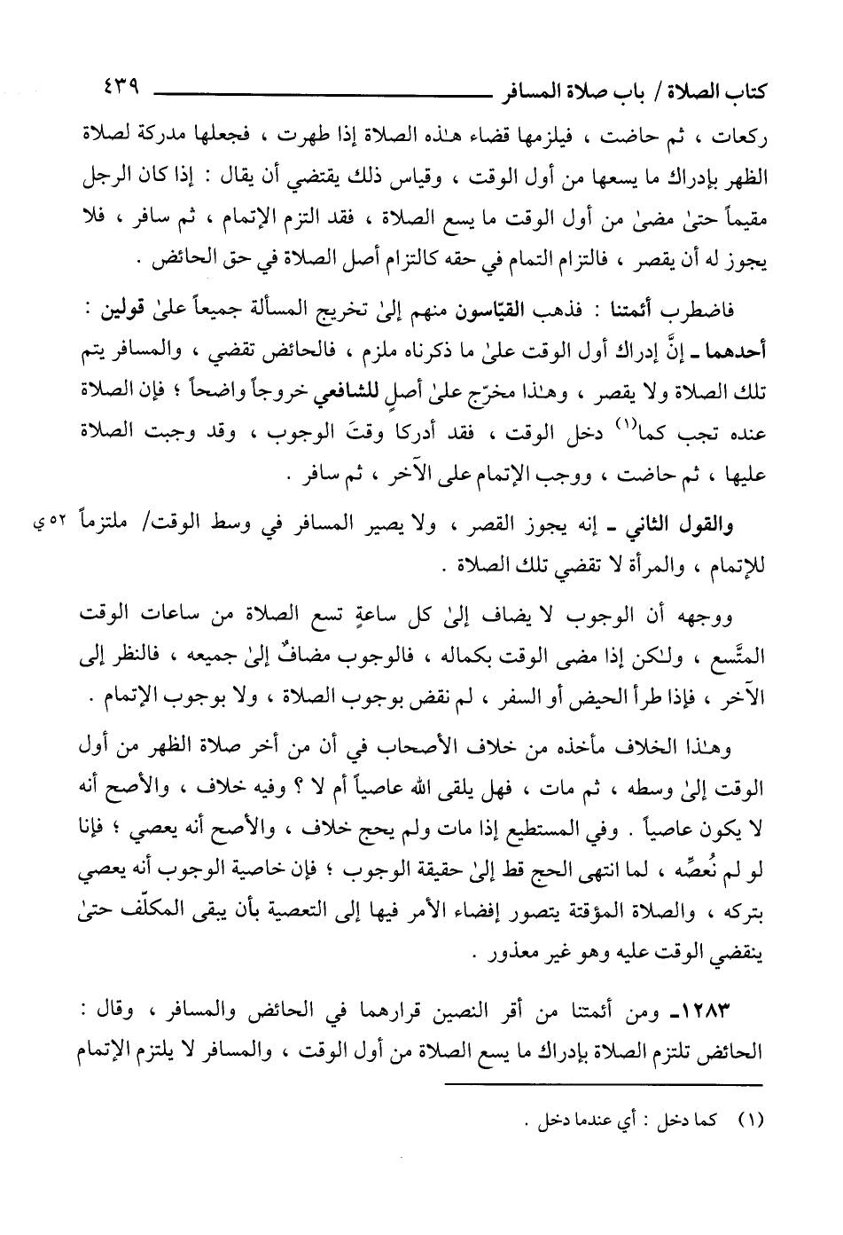1283 - ومن أئمتنا من أقر النصين قرارهما في الحائض والمسافر، وقال: الحائض تلتزم الصلاة بإدراك ما يسع الصلاة من أول الوقت، والمسافر لا يلتزم الإتمام
