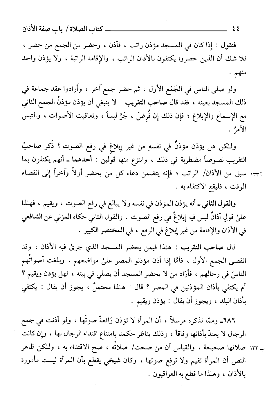 686 - وممّا نذكره مرسلاً، أن المرأة لا تؤذن رَافعةً صوتَها، ولو أذنت في جمع الرجال لا يعتدّ بأذانها وفاقاً، وذلك يناظر حكمنا بامتناع اقتداء الرجال بها، وإِن كانت صلاتها صحيحة، والقياس أن من صحت صلاتُه، صح الاقتداء به، ولكن ظاهر النص أن المرأة تقيم ولا ترفع صوتها، وكان شيخي يقطع بأن المرأة ليست مأمورة بالأذان، وهذا ما قطع به العراقيون.