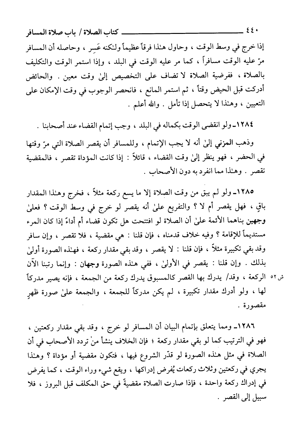 1285 - ولو لم يبق من وقت الصلاة إلا ما يسع ركعة مثلاً، فخرج وهذا المقدار باقٍ، فهل يقصر أم لا؟ والتفريع على أنه يقصر لو خرج في وسط الوقت؟ فعلى وجهين بناهما الأئمة على أن الصلاة لو افتتحت هل تكون قضاء أم أداءً إذا كان المرء مستديماً للإقامة؟ وفيه خلاف قدمناه، فإن قلنا: هي مقضية، فلا تقصر، وإن سافر وقد بقي تكبيرة مثلاً، فإن قلنا: لا يقصر، وقد بقي مقدار ركعة، فهذه الصورة أولى بذلك. وإن قلنا: يقصر في الأولى، ففي هذه الصورة وجهان: وإنما رتبنا الآن الركعة، وقد يدرك بها القصر كالمسبوق يدرك ركعة من الجمعة، فإنه يصير مدركاً لها، ولو أدرك مقدار تكبيرة، لم يكن مدركاً للجمعة، والجمعة على صورة ظهرٍ مقصورة.