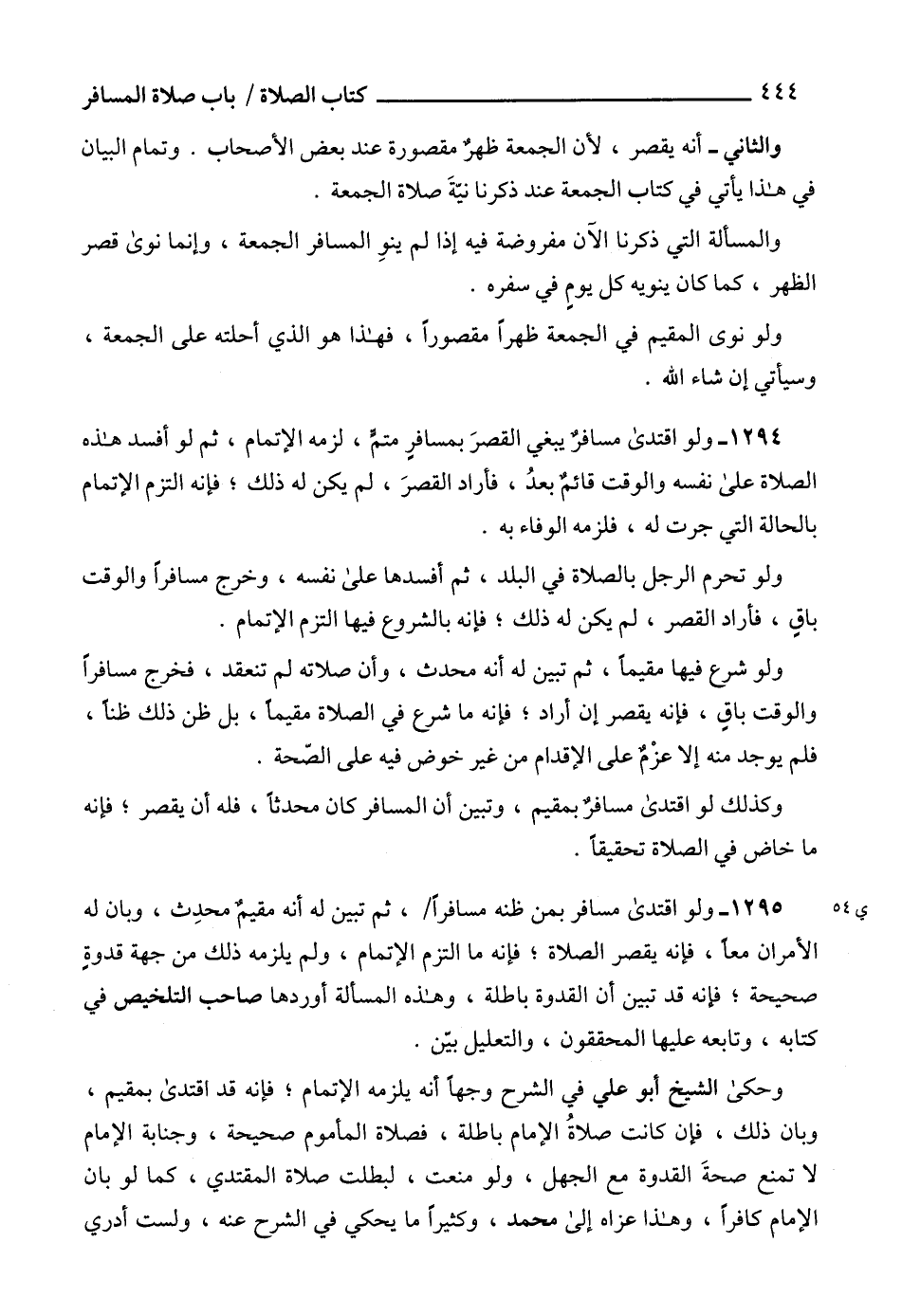 1295 - ولو اقتدى مسافر بمن ظنه مسافراً، ثم تبين له أنه مقيمٌ محدِث، وبان له الأمران معاً، فإنه يقصر الصلاة؛ فإنه ما التزم الإتمام، ولم يلزمه ذلك من جهة قدوةٍ صحيحة؛ فإنه قد تبين أن القدوة باطلة، وهذه المسألة أوردها صاحب التلخيص في كتابه، وتابعه عليها المحققون، والتعليل بيّن.