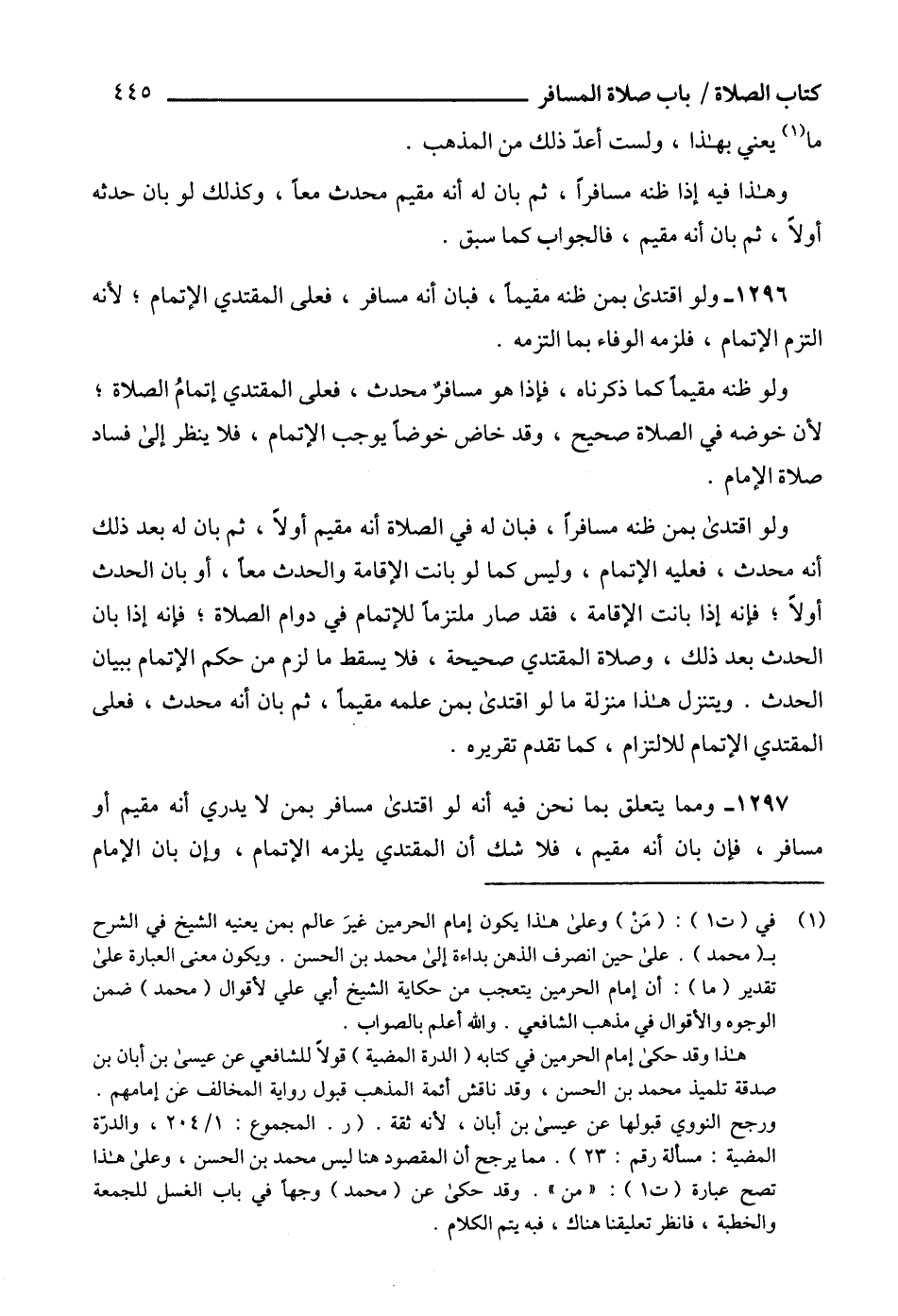 1297 - ومما يتعلق بما نحن فيه أنه لو اقتدى مسافر بمن لا يدري أنه مقيم أو مسافر، فإن بان أنه مقيم، فلا شك أن المقتدي يلزمه الإتمام، وإن بان الإمام