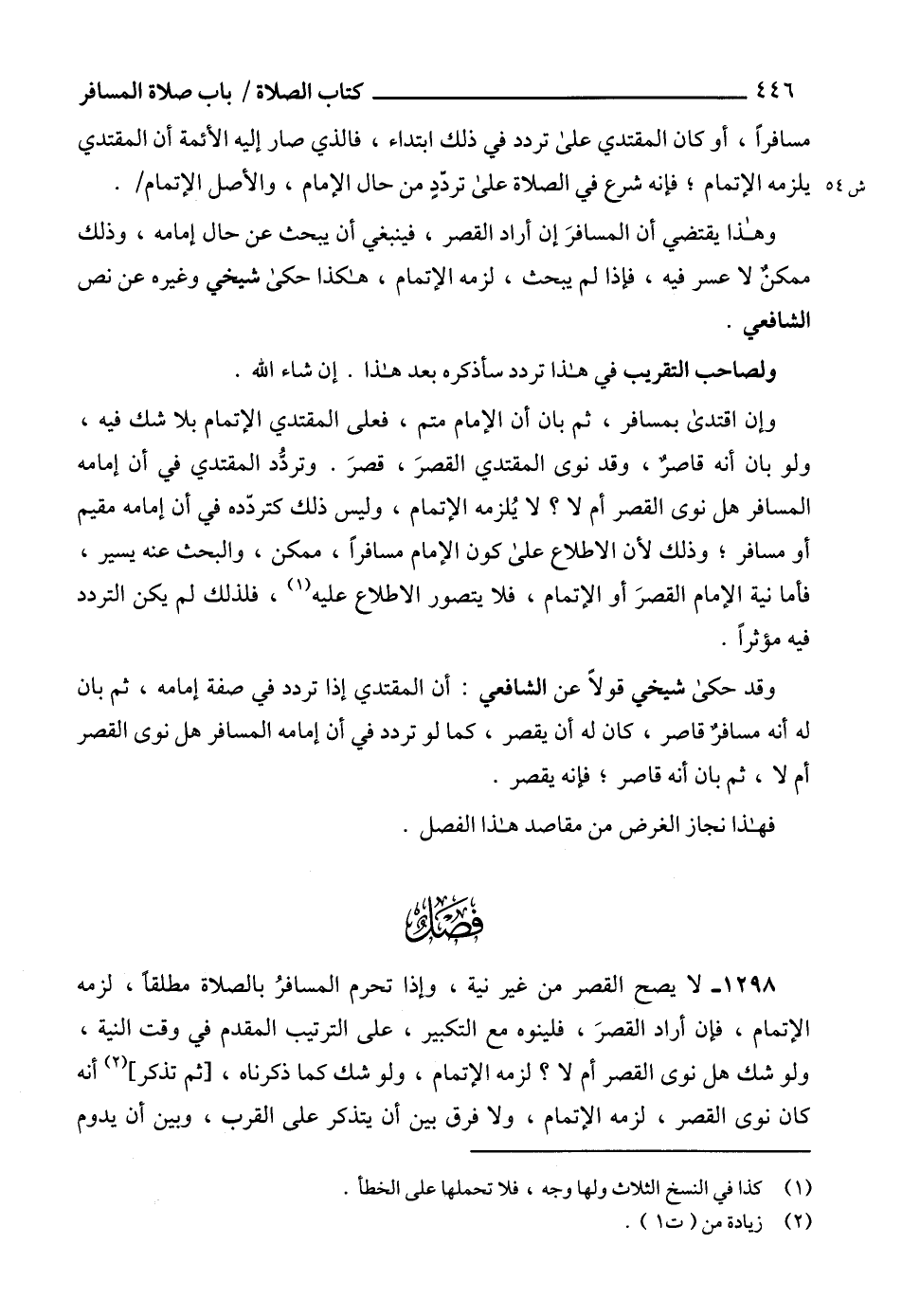 1298 - لا يصح القصر من غير نية، وإذا تحرم المسافرُ بالصلاة مطلقاً، لزمه الإتمام، فإن أراد القصرَ، فلينوه مع التكبير، على الترتيب المقدم في وقت النية، ولو شك هل نوى القصر أم لا؟ لزمه الإتمام، ولو شك كما ذكرناه، [ثم تذكر] (2) أنه كان نوى القصر، لزمه الإتمام، ولا فرق بين أن يتذكر على القرب، وبين أن يدوم