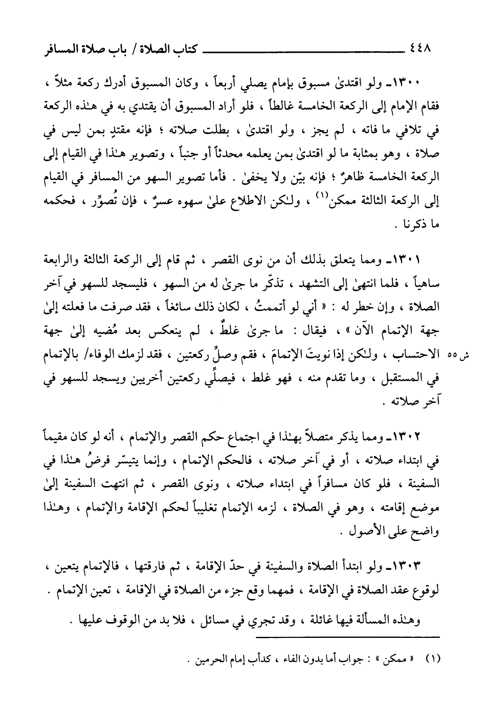 1301 - ومما يتعلق بذلك أن من نوى القصر، ثم قام إلى الركعة الثالثة والرابعة ساهياً، فلما انتهى إلى التشهد، تذكّر ما جرى له من السهو، فليسجد للسهو في آخر الصلاة، وإن خطر له: "أني لو أتممتُ، لكان ذلك سائغاً، فقد صرفت ما فعلته إلى جهة الإتمام الآن"، فيقال: ما جرى غلطٌ، لم ينعكس بعد مُضيه إلى جهة الاحتساب، ولكن إذا نويتَ الإتمامَ، فقم وصل ركعتين، فقد لزمك الوفاء بالإتمام في المستقبل، وما تقدم منه، فهو غلط، فيصلي ركعتين أخريين ويسجد للسهو في آخر صلاته.