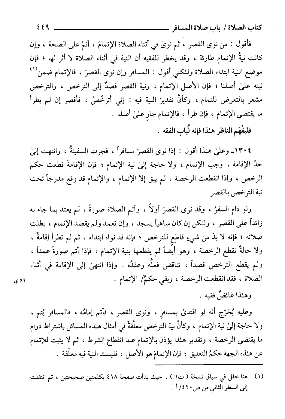 وعليه يُخرّج أنه لو اقتدى بمسافر، ونوى القصر، فأتم إمامُه، فالمسافر يتم، ولا حاجة إلى نية الإتمام، وكأن نية الترخص معلقة في أمثال هذه المسائل باشتراط دوام ما يقتضي الرخصة، وتقدير هذا يؤذن بالإتمام عند انقطاع الشرط، ثم لا يثبت للإتمام عن هذه الجهة حكمُ التعليق؛ فإن الإتمامَ هو الأصل، فليست النية فيه معلّقة.
