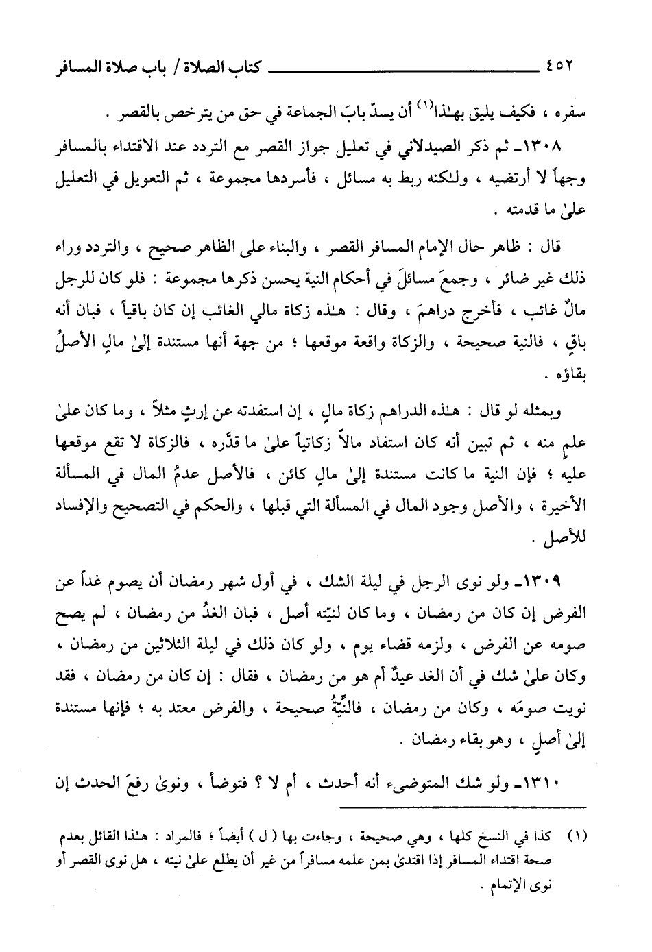 1308 - ثم ذكر الصيدلاني في تعليل جواز القصر مع التردد عند الاقتداء بالمسافر وجهاً لا أرتضيه، ولكنه ربط به مسائل، فأسردها مجموعة، ثم التعويل في التعليل على ما قدمته.