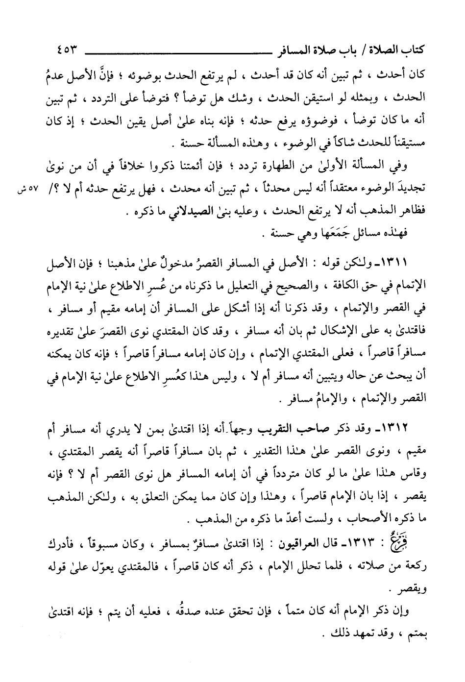 1311 - ولكن قوله: الأصل في المسافر القصرُ مدخولٌ على مذهبنا؛ فإن الأصل الإتمام في حق الكافة، والصحيح في التعليل ما ذكرناه من عُسرِ الاطلاع على نية الإمام في القصر والإتمام، وقد ذكرنا أنه إذا أشكل على المسافر أن إمامه مقيم أو مسافر، فاقتدى به على الإشكال ثم بان أنه مسافر، وقد كان المقتدي نوى القصرَ على تقديره مسافراً قاصراً، فعلى المقتدي الإتمام، وإن كان إمامه مسافراً قاصراً؛ فإنه كان يمكنه أن يبحث عن حاله ويتبين أنه مسافر أم لا، وليس هذا كعُسرِ الاطلاع على نية الإمام في القصر والإتمام، والإمامُ مسافر.