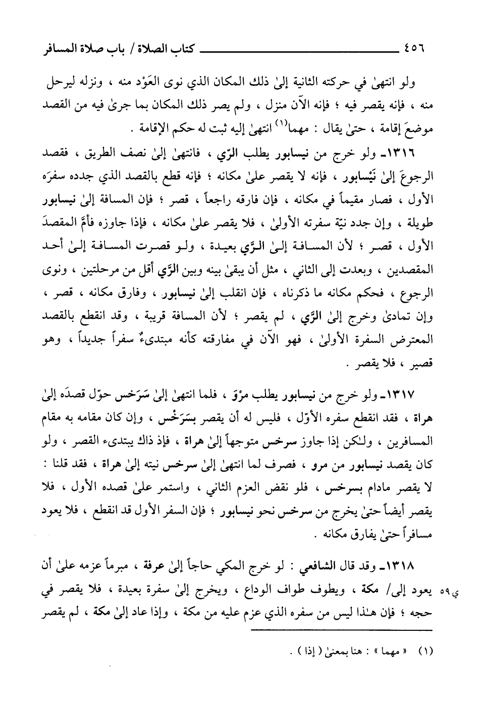 1317 - ولو خرج من نيسابور يطلب مرْوَ، فلما انتهى إلى سَرَخس حوّل قصدَه إلى هراة، فقد انقطع سفره الأوّل، فليس له أن يقصر بسَرَخْس، وإن كان مقامه به مقام المسافرين، ولكن إذا جاوز سرخس متوجهاً إلى هراة، فإذ ذاك يبتدىء القصر، ولو كان يقصد نيسابور من مرو، فصرف لما انتهى إلى سرخس نيته إلى هراة، فقد قلنا: لا يقصر مادام بسرخس، فلو نقض العزم الثاني، واستمر على قصده الأول، فلا يقصر أيضاً حتى يخرج من سرخس نحو نيسابور، فإن السفر الأول قد انقطع، فلا يعود مسافراً حتى يفارق مكانه.