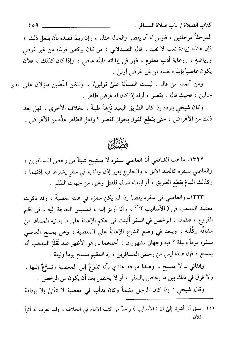 1322 - مذهب الشافعي أن العاصي بسفره لا يستبيح شيئاًً من رخص المسافرين، والعاصي بسفره كالعبد الآبق، والخارج بغير إذن والديه في سفرٍ يشترط فيه إذنهما، وكذلك الهامّ بقطع الطريق، أو ابتغاء مسلمٍ للقتل وغيره من جهات الظلم.