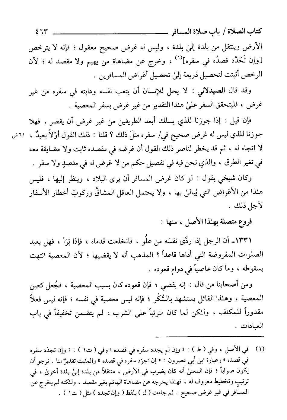 (1) في الأصل، وفي (ط): "وإن لم يجدد سفره في قصده" وفي (ت 1): "وإن تجدد سفره في قصده" وعبارة ابن أبي عصرون: "إن تجرّد سفره في قصده" والمثبت تقديرٌ منا. نرجو أن يكون صواباً؛ فإن المعنى أنه كان يضرب في الأرض، منتقلاً من بلدة إلى بلدة أخرى، في ترتيب وتخطيط معروف له، فهذا يخرجه عن مضاهاة الهائم بغير مقصد، ولكنه لم يخرج عن المسافر في غير غرض صحيح. ثم جاءت (ل) بلفظ (وإن تجدد) مثل (ت 1).