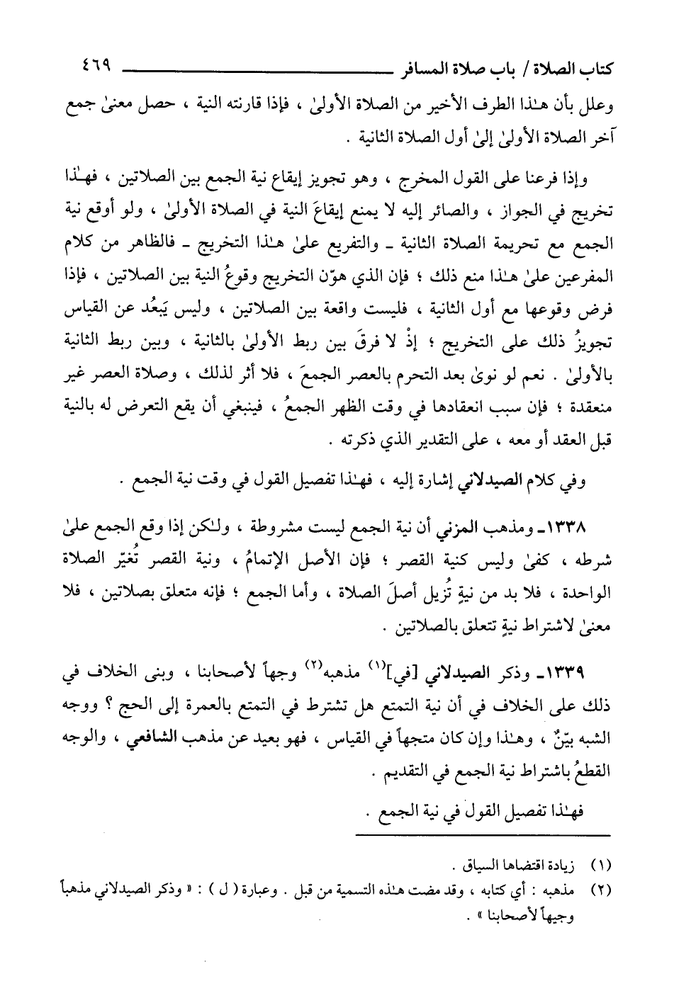 1338 - ومذهب المزني أن نية الجمع ليست مشروطة، ولكن إذا وقع الجمع على شرطه، كفى وليس كنية القصر؛ فإن الأصل الإتمامُ، ونية القصر تُغيّر الصلاة الواحدة، فلا بد من نيةٍ تُزيل أصلَ الصلاة، وأما الجمع؛ فإنه متعلق بصلاتين، فلا معنى لاشتراط نيةٍ تتعلق بالصلاتين.
