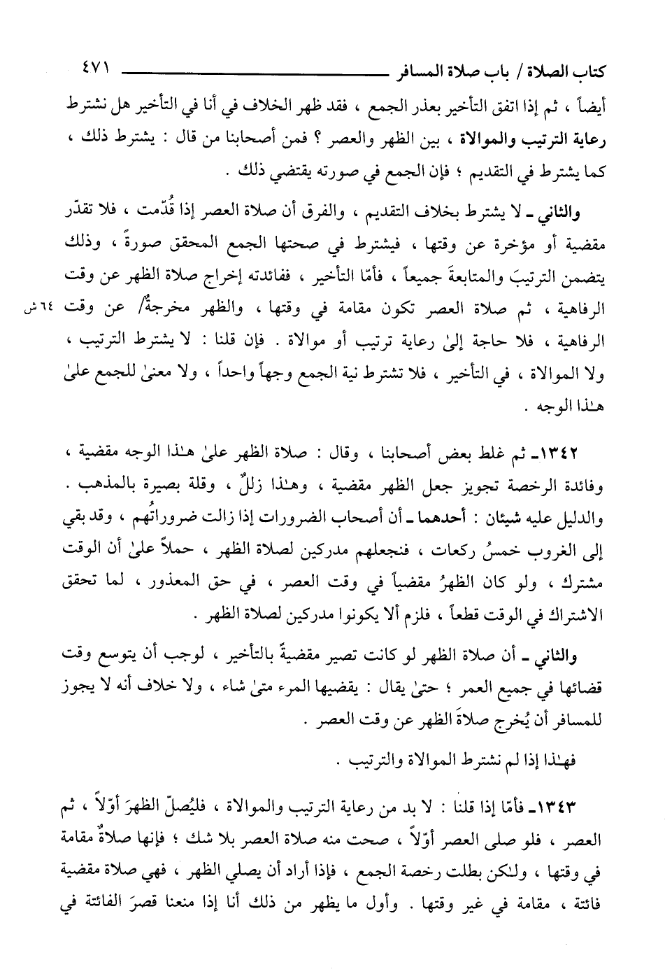 1343 - فأمّا إذا قلنا: لا بد من رعاية الترتيب والموالاة، فليُصلّ الظهرَ أوّلاً، ثم العصر، فلو صلى العصر أوّلاً، صحت منه صلاة العصر بلا شك؛ فإنها صلاة مقامة في وقتها، ولكن بطلت رخصة الجمع، فإذا أراد أن يصلي الظهر، فهي صلاة مقضية فائتة، مقامة في غير وقتها. وأول ما يظهر من ذلك أنا إذا منعنا قصرَ الفائتة في