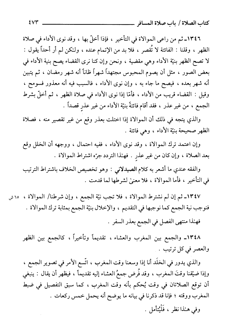 1347 - ثم إن لم نشترط الموالاة، فلا تجب نيّة الجمع، وإن شرطنا الموالاة، فنوجب نية الجمع كما نوجبها في التقديم، والإخلال بنيّة الجمع بمثابة ترك الموالاة.