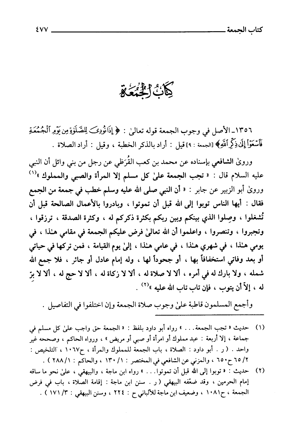 1356 - الأصل في وجوب الجمعة قوله تعالى: {إِذَا نُودِيَ لِلصَّلَاةِ مِنْ يَوْمِ الْجُمُعَةِ فَاسْعَوْا إِلَى ذِكْرِ اللَّهِ} [الجمعة: 9] قيل: أراد بالذكر الخطبة، وقيل: أراد الصلاة.
