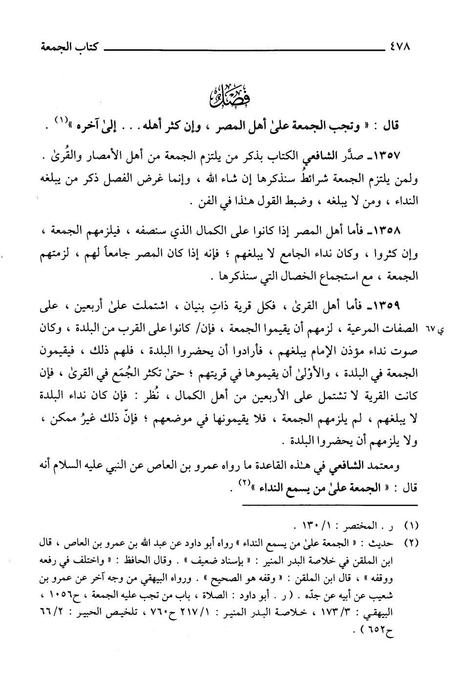 1357 - صدَّر الشافعي الكتاب بذكر من يلتزم الجمعة من أهل الأمصار والقُرى. ولمن يلتزم الجمعة شرائطُ سنذكرها إن شاء الله، وإنما غرض الفصل ذكر من يبلغه النداء، ومن لا يبلغه، وضبط القول هذا في الفن.