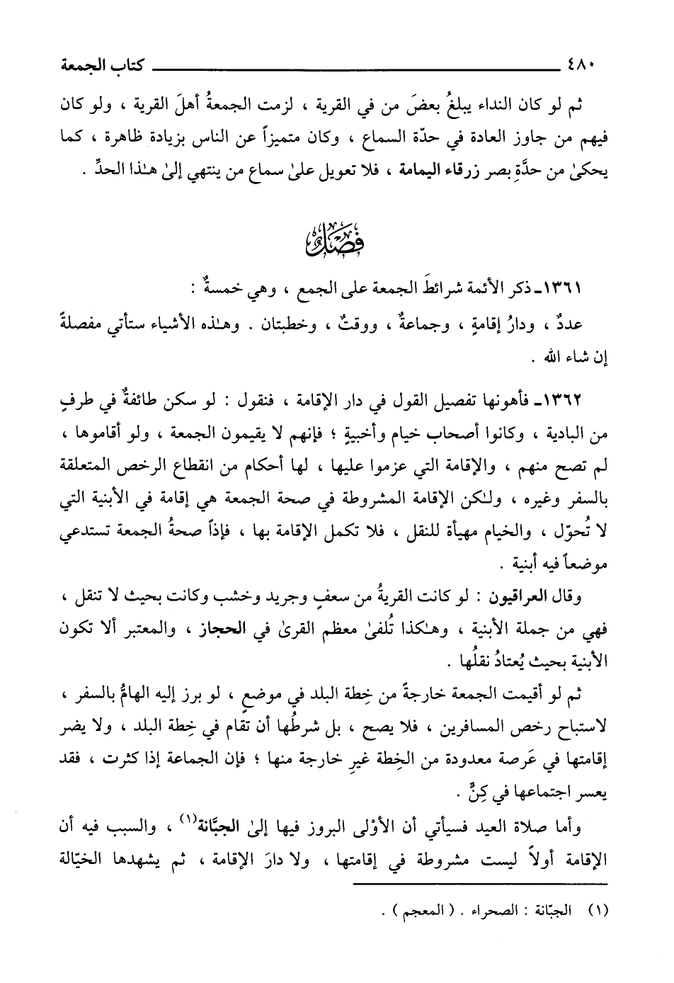 1361 - ذكر الأئمة شرائطَ الجمعة على الجمع، وهي خمسة: