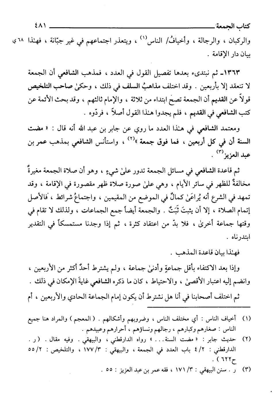 1363 - ثم نبتدىء بعدها تفصيل القول في العدد، فمذهب الشافعي أن الجمعة لا تنعقد إلا بأربعين. وقد اختلف مذاهبُ السلف في ذلك، وحكى صاحب التلخيص قولاً عن القديم أن الجمعة تصح ابتداء من ثلاثة، والإمام ثالثهم، وقد بحث الأئمة عن كتب الشافعي في القديم، فلم يجدوا هذا القول أصلاً، فردّوه.