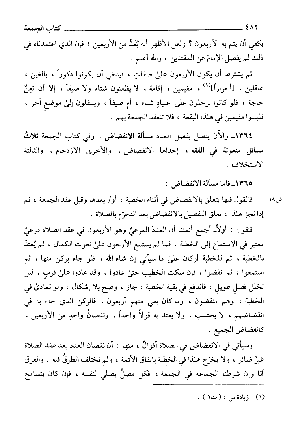 1364 - والآن يتصل بفصل العدد مسألة الانفضاض. وفي كتاب الجمعة ثلاثُ مسائل منعوتة في الفقه، إحداها الانفضاض، والأخرى الازدحام، والثالثة الاستخلاف.