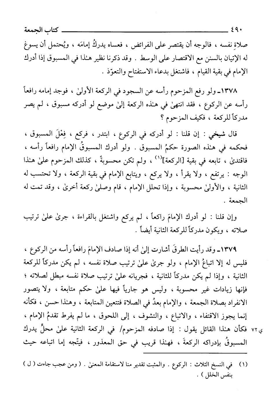 1379 - وقد رأيت الطرقَ أشارت إلى أنه إذا صادف الإمامَ رافعاً رأسه من الركوع، فليس له إلا اتباعُ الإمام، ولو جرى على ترتيب صلاة نفسه، لم يكن مدركاً للركعة الثانية، وإذا لم يكن مدركاً للثانية، فجريانه على ترتيب صلاة نفسه مبطل لصلاته؛ فإنها زيادات غير محسوبة، وليس هو جارياً فيها على حكم متابعة، ولا يتصور الانفراد بصلاة الجمعة، والإمام بعدُ في الصلاة فتتعين المتابعة، وهذا حسن، فكأنه إنما يجوز الاقتفاء، والاتباع، والتشوف، إلى اللحوق، ما لم يفرط تقدمُ الإمام، فكأن هذا القائل يقول: إذا صادفه المزحوم في الركعة الثانية على محلٍّ يدرك المسبوقُ بإدراكه الركعةَ، فهذا قريب في حق المعذور، فيتّجه إما اتباعه حيث