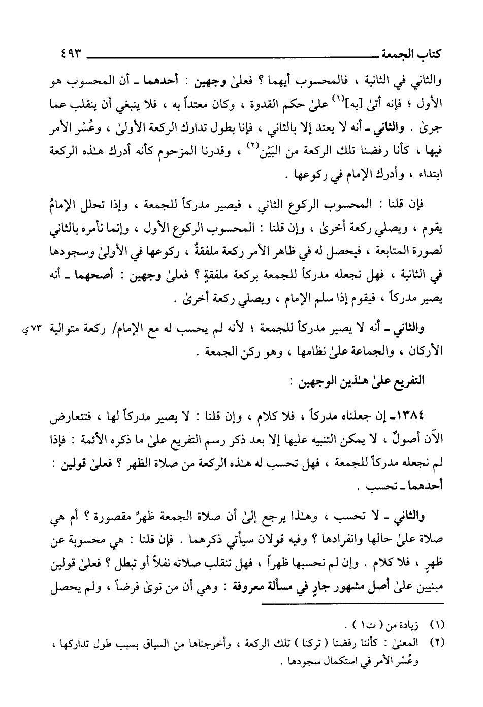 1384 - إن جعلناه مدركاً، فلا كلام، وإن قلنا: لا يصير مدركاً لها، فتتعارض الآن أصولٌ، لا يمكن التنبيه عليها إلا بعد ذكر رسم التفريع على ما ذكره الأئمة: فإذا لم نجعله مدركاً للجمعة، فهل تحسب له هذه الركعة من صلاة الظهر؟ فعلى قولين: أحدهما - تحسب.