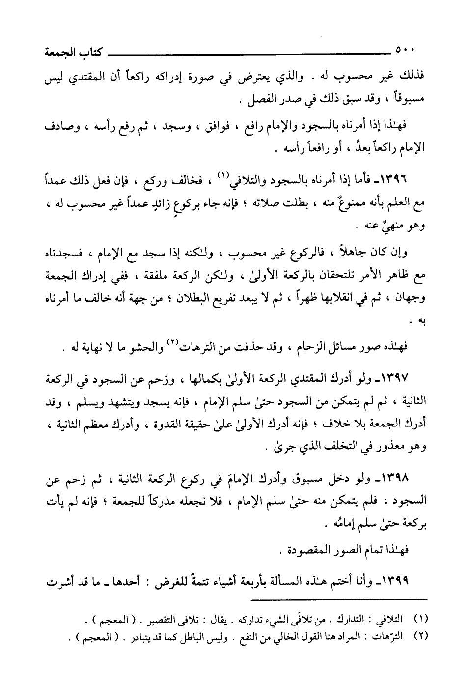 1397 - ولو أدرك المقتدي الركعة الأولى بكمالها، وزحم عن السجود في الركعة الثانية، ثم لم يتمكن من السجود حتى سلم الإمام، فإنه يسجد ويتشهد ويسلم، وقد أدرك الجمعة بلا خلاف؛ فإنه أدرك الأولى على حقيقة القدوة، وأدرك معظم الثانية، وهو معذور في التخلف الذي جرى.