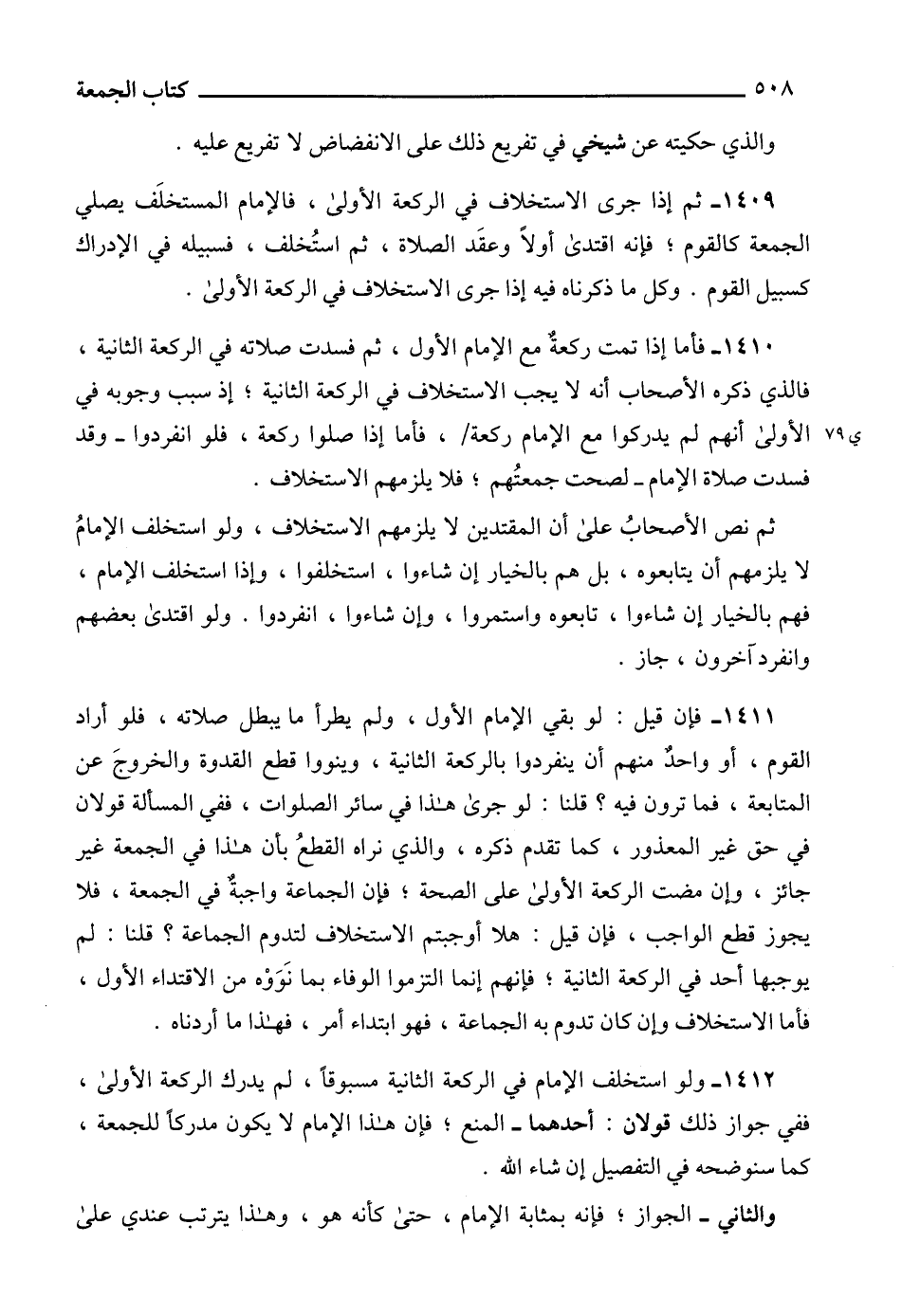 1412 - ولو استخلف الإمام في الركعة الثانية مسبوقاً، لم يدرك الركعة الأولى، ففي جواز ذلك قولان: أحدهما - المنع؛ فإن هذا الإمام لا يكون مدركاً للجمعة، كما سنوضحه في التفصيل إن شاء الله.