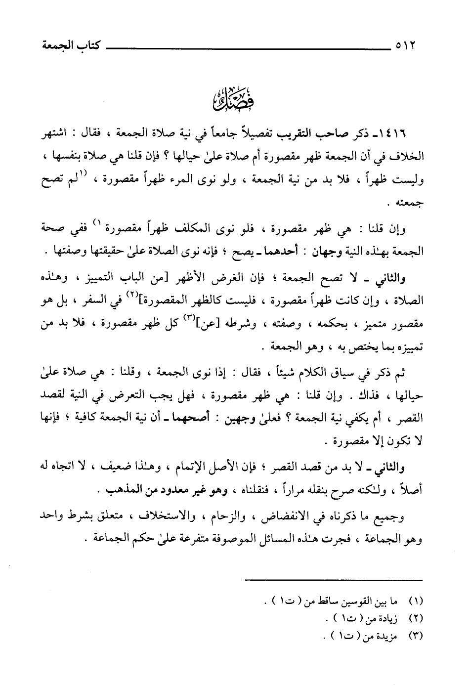 1416 - ذكر صاحب التقريب تفصيلاً جامعاً في نية صلاة الجمعة، فقال: اشتهر الخلاف في أن الجمعة ظهر مقصورة أم صلاة على حيالها؟ فإن قلنا هي صلاة بنفسها، وليست ظهراً، فلا بد من نية الجمعة، ولو نوى المرء ظهراً مقصورة، (1 لم تصح جمعته.