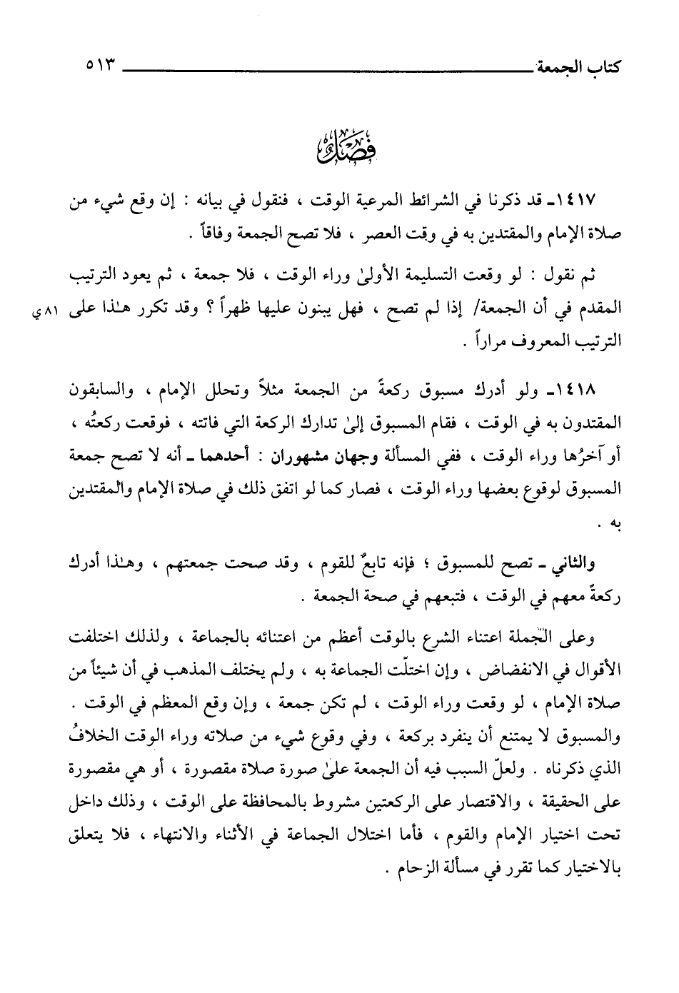 1418 - ولو أدرك مسبوق ركعةً من الجمعة مثلاً وتحلل الإمام، والسابقون المقتدون به في الوقت، فقام المسبوق إلى تدارك الركعة التي فاتته، فوقعت ركعتُه، أو آخرُها وراء الوقت، ففي المسألة وجهان مشهوران: أحدهما - أنه لا تصح جمعة المسبوق لوقوع بعضها وراء الوقت، فصار كما لو اتفق ذلك في صلاة الإمام والمقتدين به.