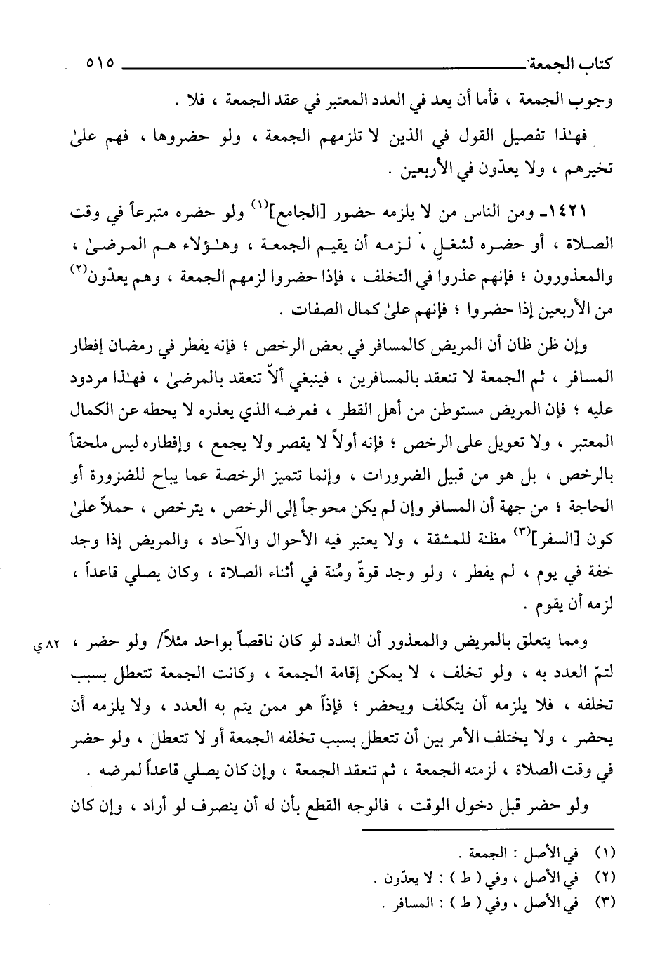 1421 - ومن الناس من لا يلزمه حضور [الجامع] (1) ولو حضره متبرعاً في وقت الصلاة، أو حضره لشغل، لزمه أن يقيم الجمعة، وهؤلاء هم المرضى، والمعذورون؛ فإنهم عذروا في التخلف، فإذا حضروا لزمهم الجمعة، وهم يعدّون (2) من الأربعين إذا حضروا؛ فإنهم على كمال الصفات.