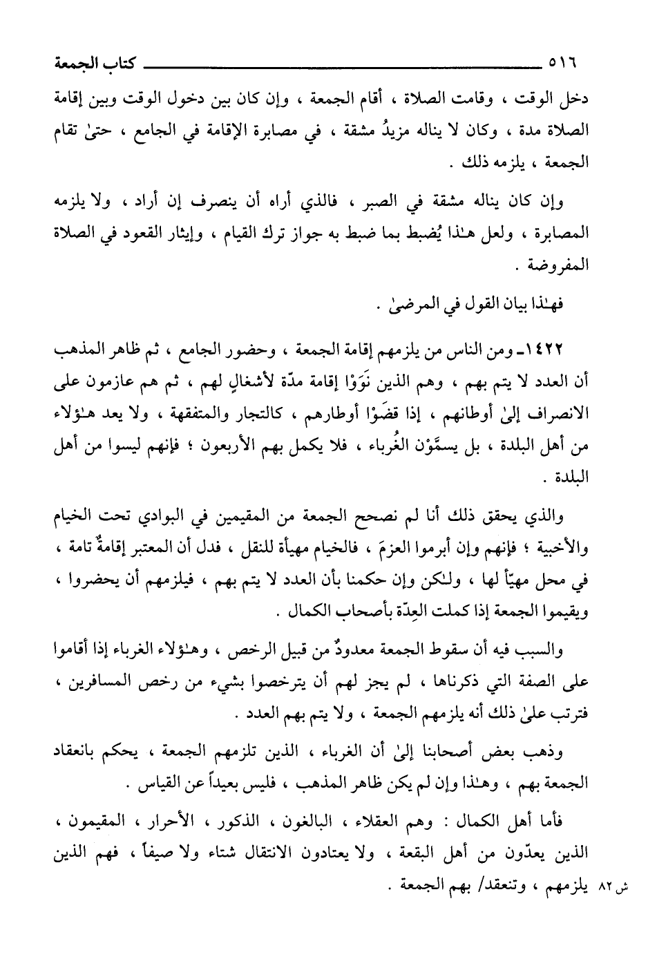 1422 - ومن الناس من يلزمهم إقامة الجمعة، وحضور الجامع، ثم ظاهر المذهب أن العدد لا يتم بهم، وهم الذين نَوَوْا إقامة مدّة لأشغالٍ لهم، ثم هم عازمون على الانصراف إلى أوطانهم، إذا قضَوْا أوطارهم، كالتجار والمتفقهة، ولا يعد هؤلاء من أهل البلدة، بل يسمَّوْن الغُرباء، فلا يكمل بهم الأربعون؛ فإنهم ليسوا من أهل البلدة.