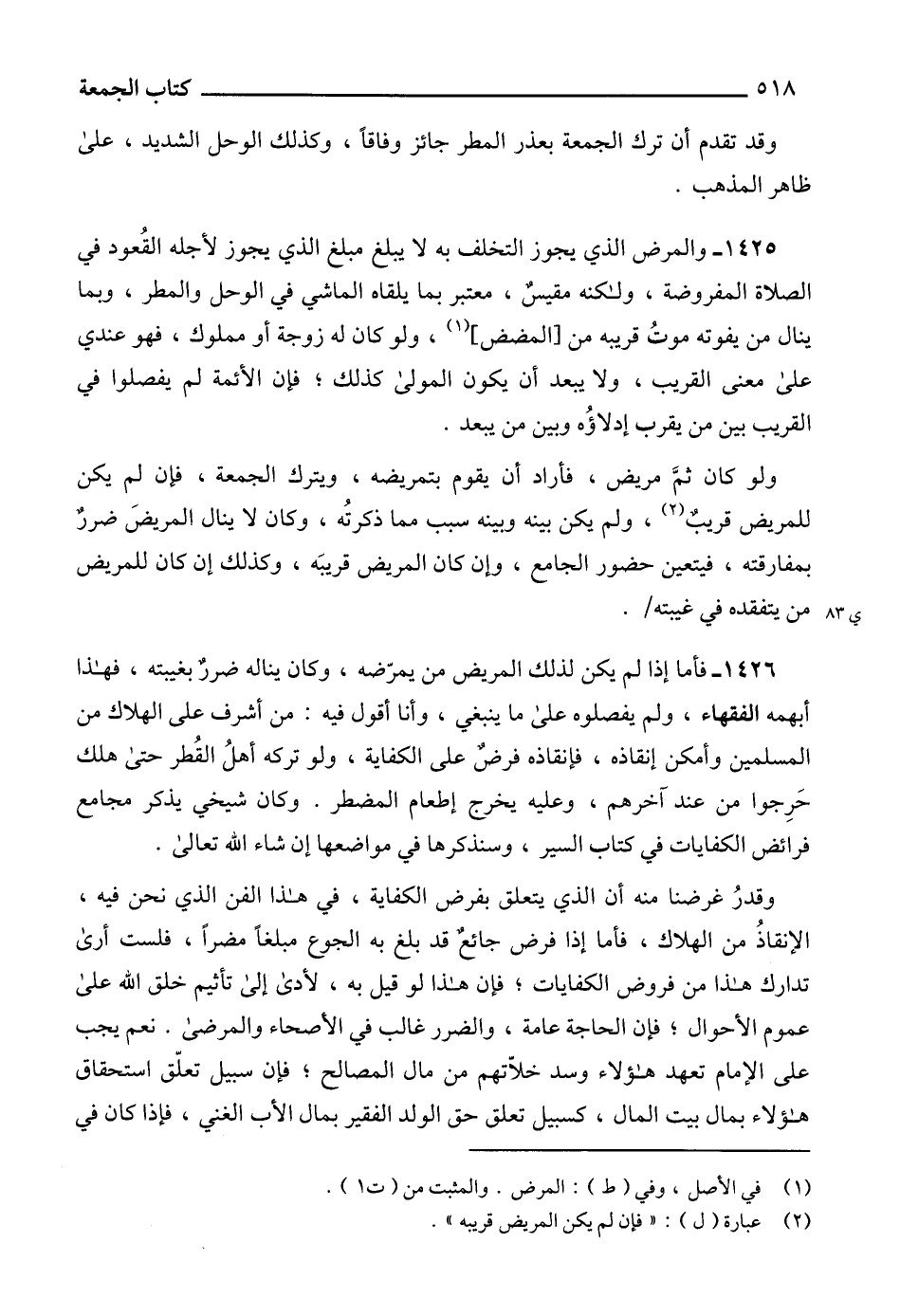 1425 - والمرض الذي يجوز التخلف به لا يبلغ مبلغ الذي يجوز لأجله القُعود في الصلاة المفروضة، ولكنه مقيسٌ، معتبر بما يلقاه الماشي في الوحل والمطر، وبما ينال من يفوته موتُ قريبه من [المضض] (1)، ولو كان له زوجة أو مملوك، فهو عندي على معنى القريب، ولا يبعد أن يكون المولى كذلك، فإن الأئمة لم يفصلوا في القريب بين من يقرب إدلاؤُه وبين من يبعد.
