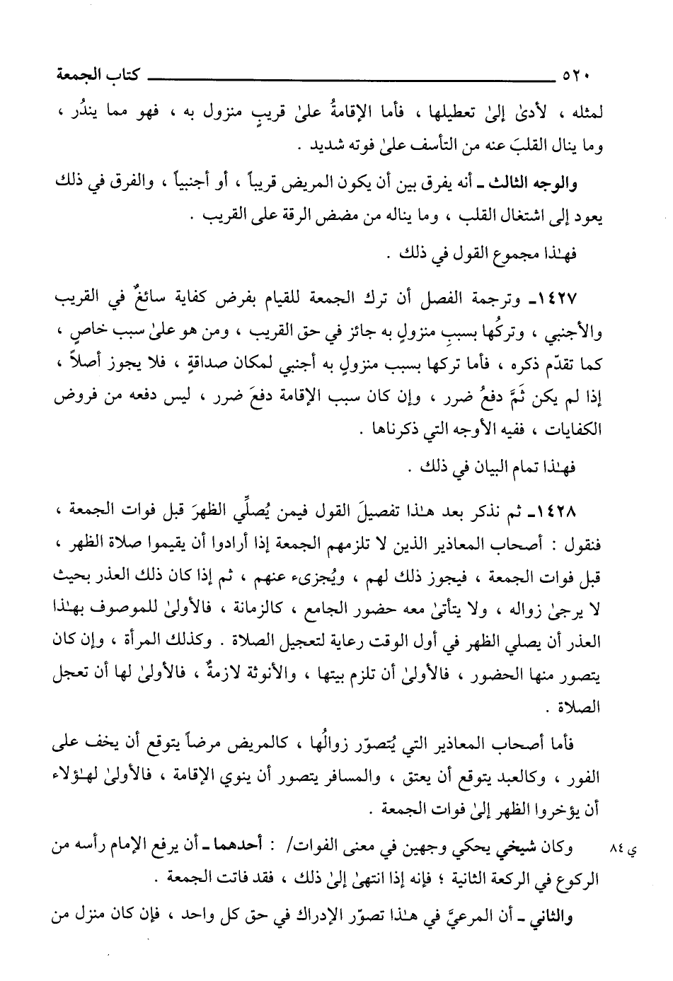 1427 - وترجمة الفصل أن ترك الجمعة للقيام بفرض كفاية سائغ في القريب والأجنبي، وتركُها بسببِ منزولٍ به جائز في حق القريب، ومن هو على سبب خاصٍ، كما تقدم ذكره، فأما تركها بسبب منزولٍ به أجنبي لمكان صداقةٍ، فلا يجوز أصلاً، إذا لم يكن ثمَّ دفعُ ضرر، وإن كان سبب الإقامة دفعَ ضرر، ليس دفعه من فروض الكفايات، ففيه الأوجه التي ذكرناها.