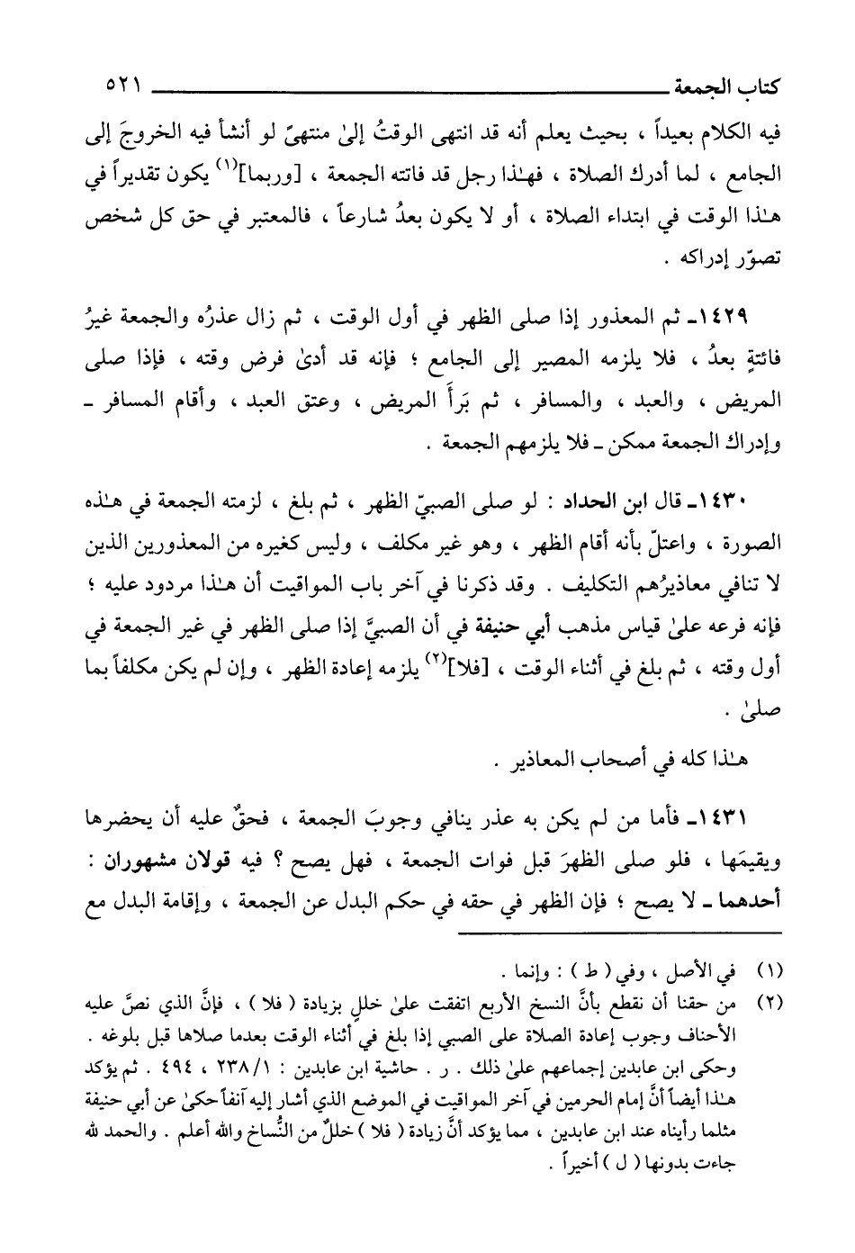 (2) من حقنا أن نقطع بأن النسخ الأربع اتفقت على خلل بزيادة (فلا)، فإن الذي نص عليه الأحناف وجوب إعادة الصلاة على الصبي إذا بلغ في أثناء الوقت بعدما صلاها قبل بلوغه.