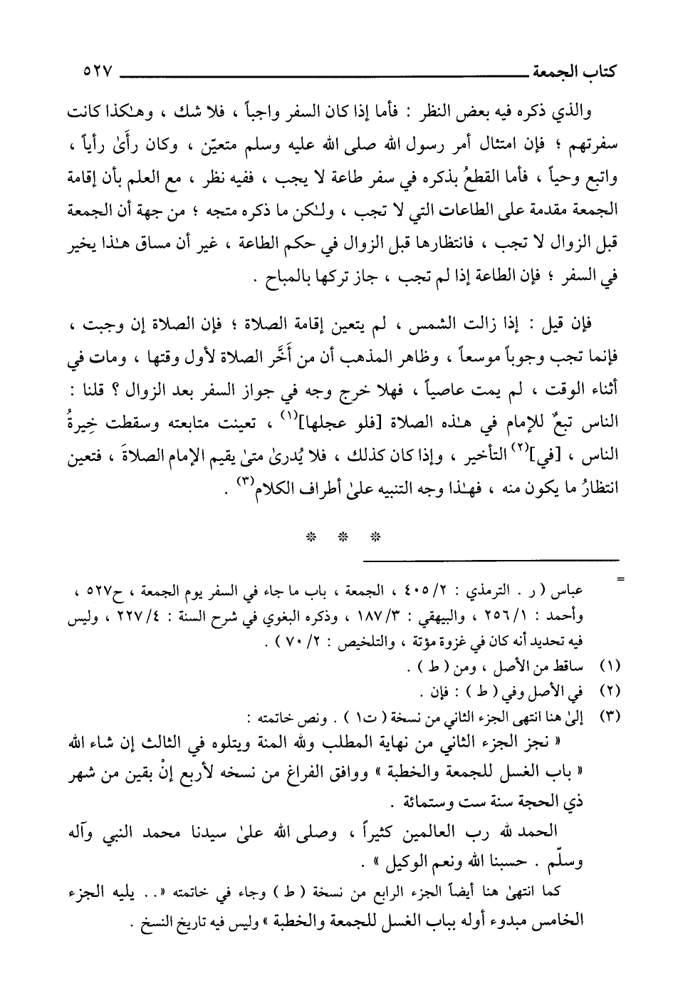 كما انتهى هنا أيضاً الجزء الرابع من نسخة (ط) وجاء في خاتمته " .. يليه الجزء الخامس مبدوء أوله بباب الغسل للجمعة والخطبة" وليس فيه تاريخ النسخ.