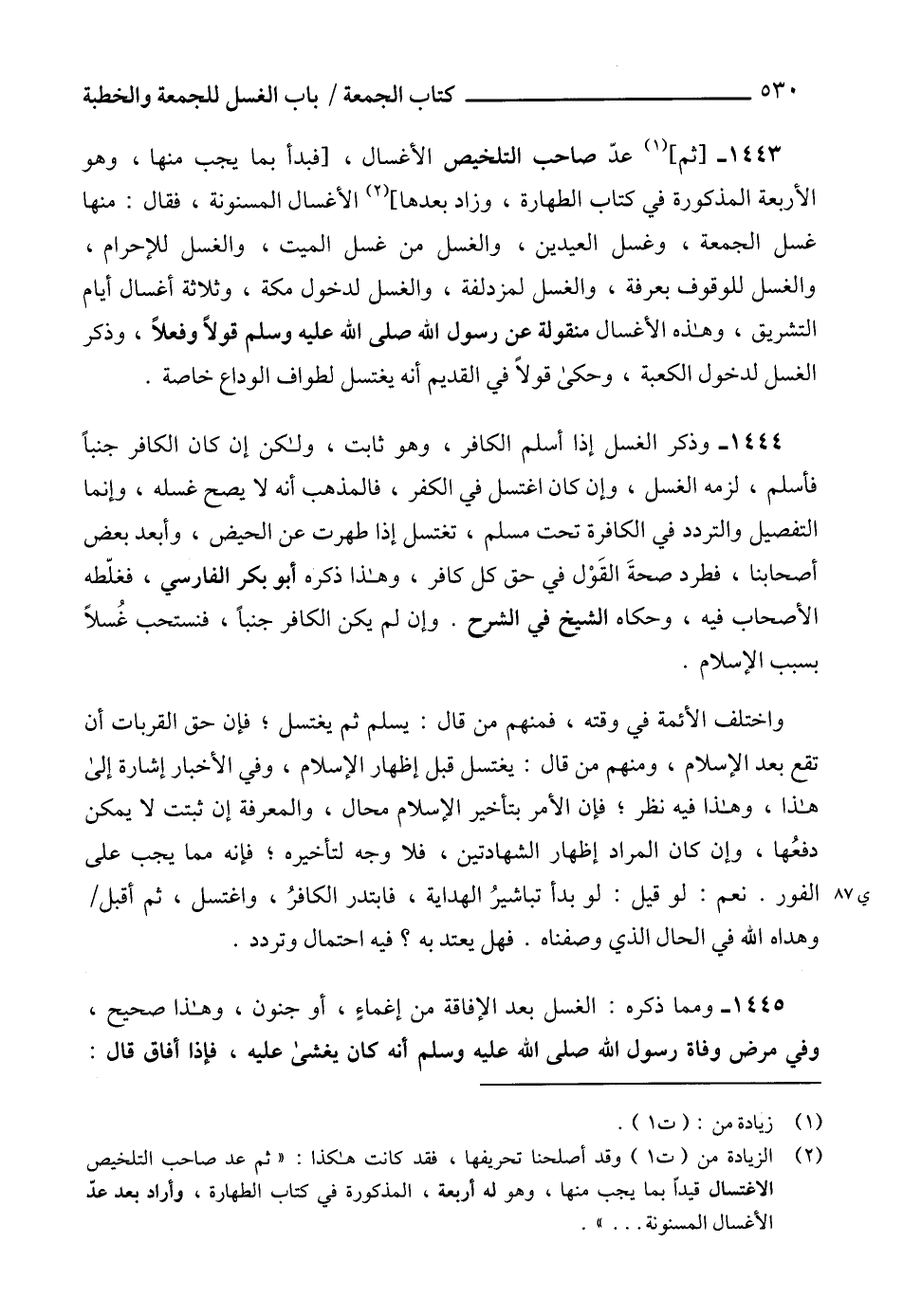 (2) الزيادة من (ت 1) وقد أصلحنا تحريفها، فقد كانت هكذا: "ثم عد صاحب التلخيص الاغتسال قيداً بما يجب منها، وهو له أربعة، المذكورة في كتاب الطهارة، وأراد بعد عدّ الأغسال المسنونة ... ".