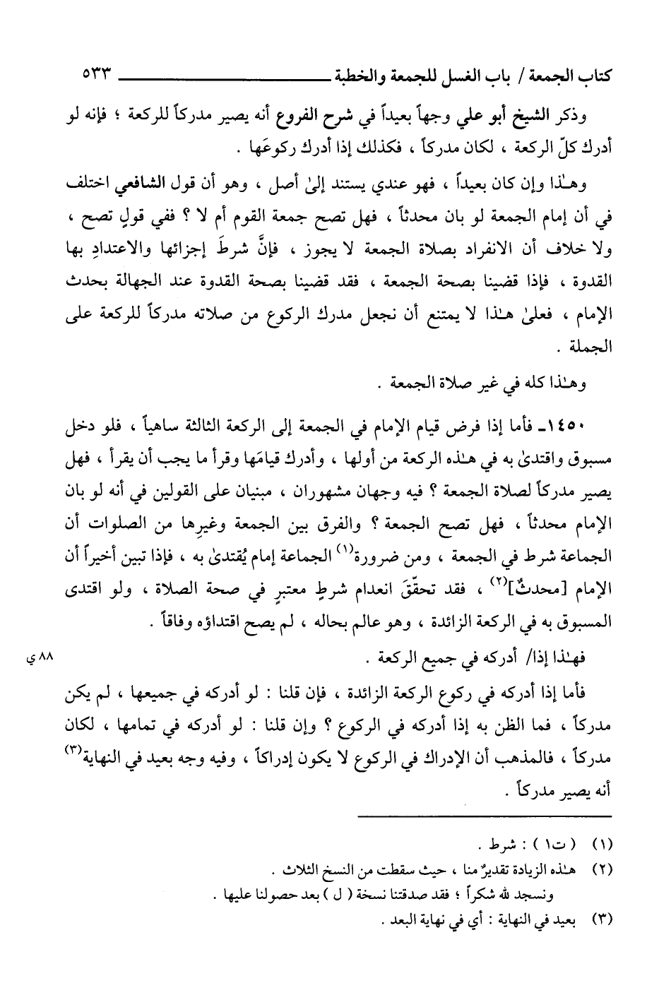 1450 - فأما إذا فرض قيام الإمام في الجمعة إلى الركعة الثالثة ساهياً، فلو دخل مسبوق واقتدى به في هذه الركعة من أولها، وأدرك قيامَها وقرأ ما يجب أن يقرأ، فهل يصير مدركاً لصلاة الجمعة؟ فيه وجهان مشهوران، مبنيان على القولين في أنه لو بان الإمام محدثاً، فهل تصح الجمعة؟ والفرق بين الجمعة وغيرِها من الصلوات أن الجماعة شرط في الجمعة، ومن ضرورة (1) الجماعة إمام يُقتدى به، فإذا تبين أخيراً أن الإمام [محدثٌ] (2)، فقد تحقّقَ انعدام شرط معتبرٍ في صحة الصلاة، ولو اقتدى المسبوق به في الركعة الزائدة، وهو عالم بحاله، لم يصح اقتداؤه وفاقاً.