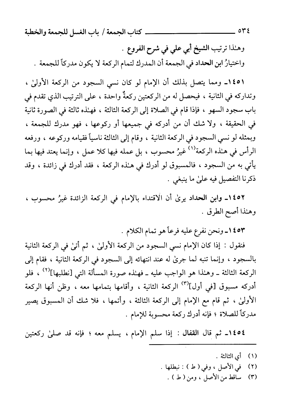 1452 - وابن الحداد يرى أن الاقتداء بالإمام في الركعة الزائدة غيرُ محسوب، وهذا أصح الطرق.