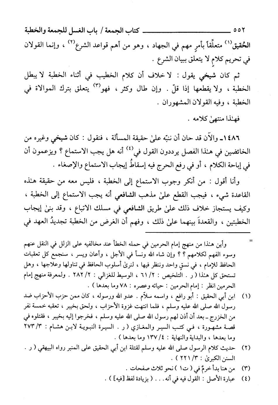 1486 - والآن قد حان أن ننبه على حقيقة المسألة، فنقول: كان شيخي وغيره من الخائضين في هذا الفصل يرددون القول في (4) أنه هل يجب الاستماع؟ ويزعمون أن في إباحة الكلام، أو في رفع الحرج فيه إسقاطُ إيجاب الاستماع والإصغاء.