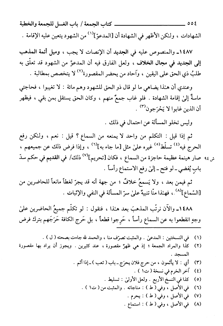 1487 - والمنصوص عليه في الجديد أن الإنصات لا يجب، وميل أئمة المذهب إلى الجديد في مجال الخلاف، ولعل الفارق فيه أن المدعوَّ من الشهود قد تعلّق به طلبُ ذي الحق على اليقين، وآحاد من يحضر المقصورة (2) لا يتخصص بمطالبة.