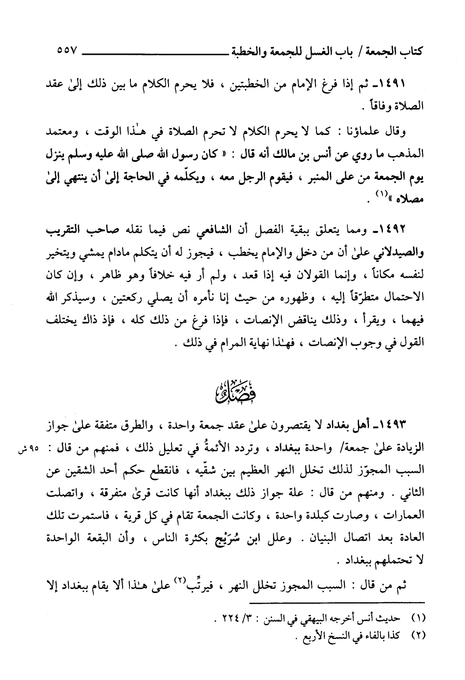 1493 - أهل بغداد لا يقتصرون على عقد جمعة واحدة، والطرق متفقة على جواز الزيادة على جمعة واحدة ببغداد، وتردد الأئمةُ في تعليل ذلك، فمنهم من قال: السبب المجوّز لذلك تخلل النهر العظيم بين شقّيه، فانقطع حكم أحد الشقين عن الثاني. ومنهم من قال: علة جواز ذلك ببغداد أنها كانت قرى متفرقة، واتصلت العمارات، وصارت كبلدة واحدة، وكانت الجمعة تقام في كل قرية، فاستمرت تلك العادة بعد اتصال البنيان. وعلل ابن سُرَيْج بكثرة الناس، وأن البقعة الواحدة لا تحتملهم ببغداد.