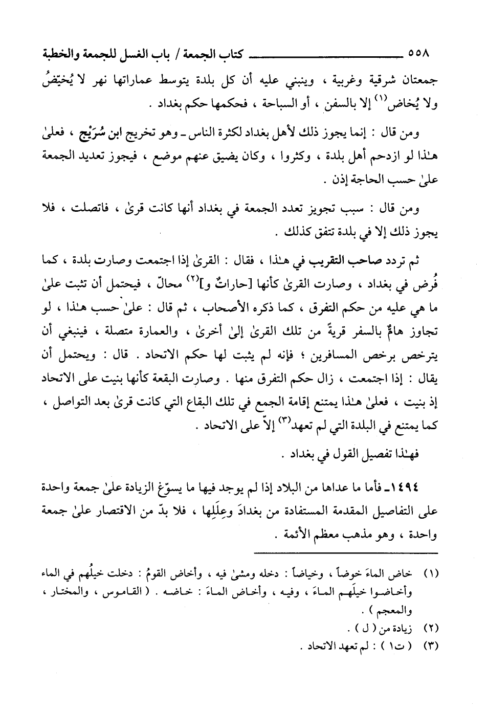 جمعتان شرقية وغربية، وينبني عليه أن كل بلدة يتوسط عماراتها نهر لا يُخيضُ ولا يُخاض (1) إلا بالسفن، أو السباحة، فحكمها حكم بغداد.