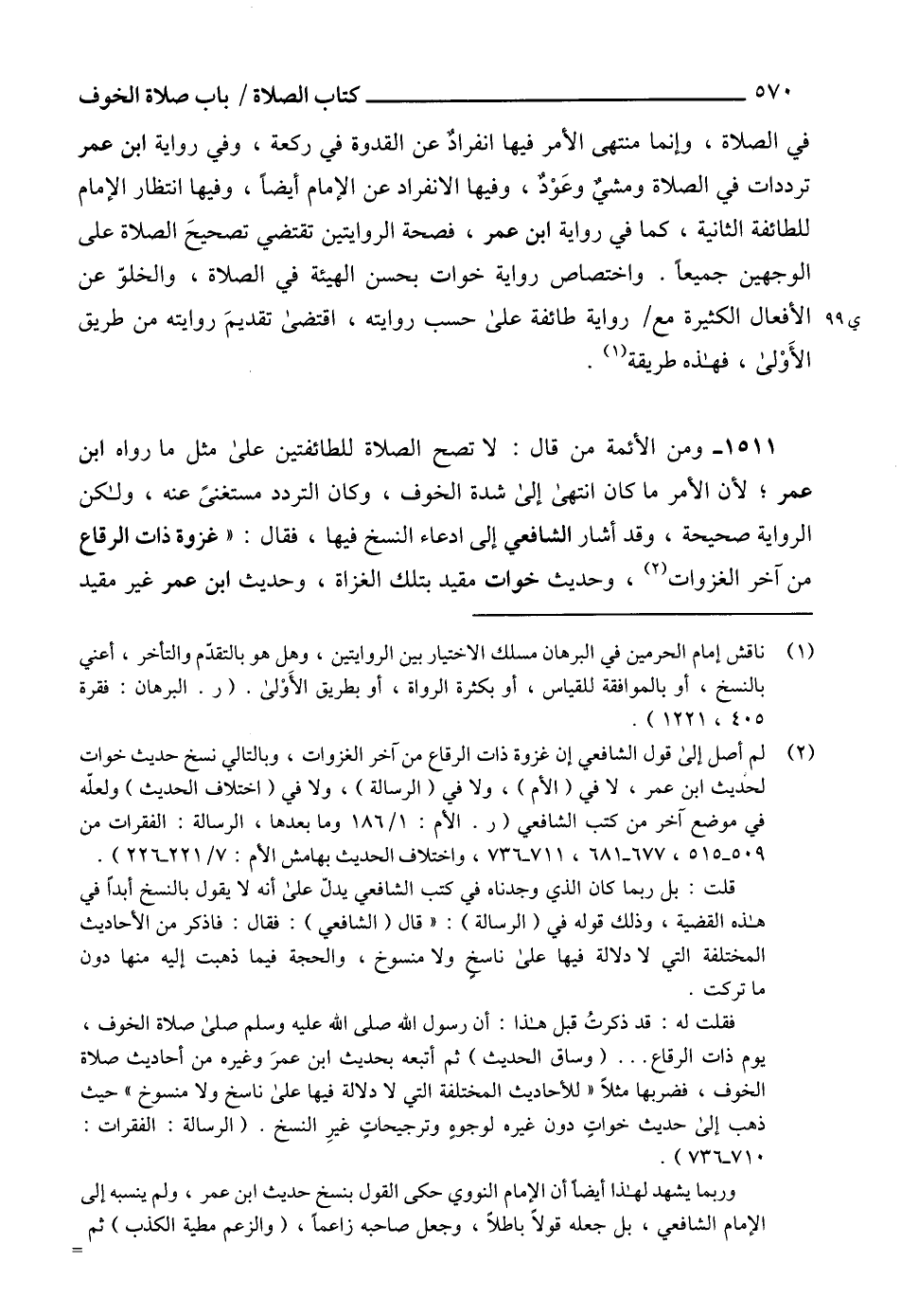 (2) لم أصل إلى قول الشافعي إن غزوة ذات الرقاع من آخر الغزوات، وبالتالي نسخ حديث خوات لحديث ابن عمر، لا في (الأم)، ولا في (الرسالة)، ولا في (اختلاف الحديث) ولعله في موضع آخر من كتب الشافعي (ر. الأم: 1/ 186 وما بعدها، الرسالة: الفقرات من 509 - 515، 677 - 681، 711 - 736، واختلاف الحديث بهامش الأم: 7/ 221 - 226).