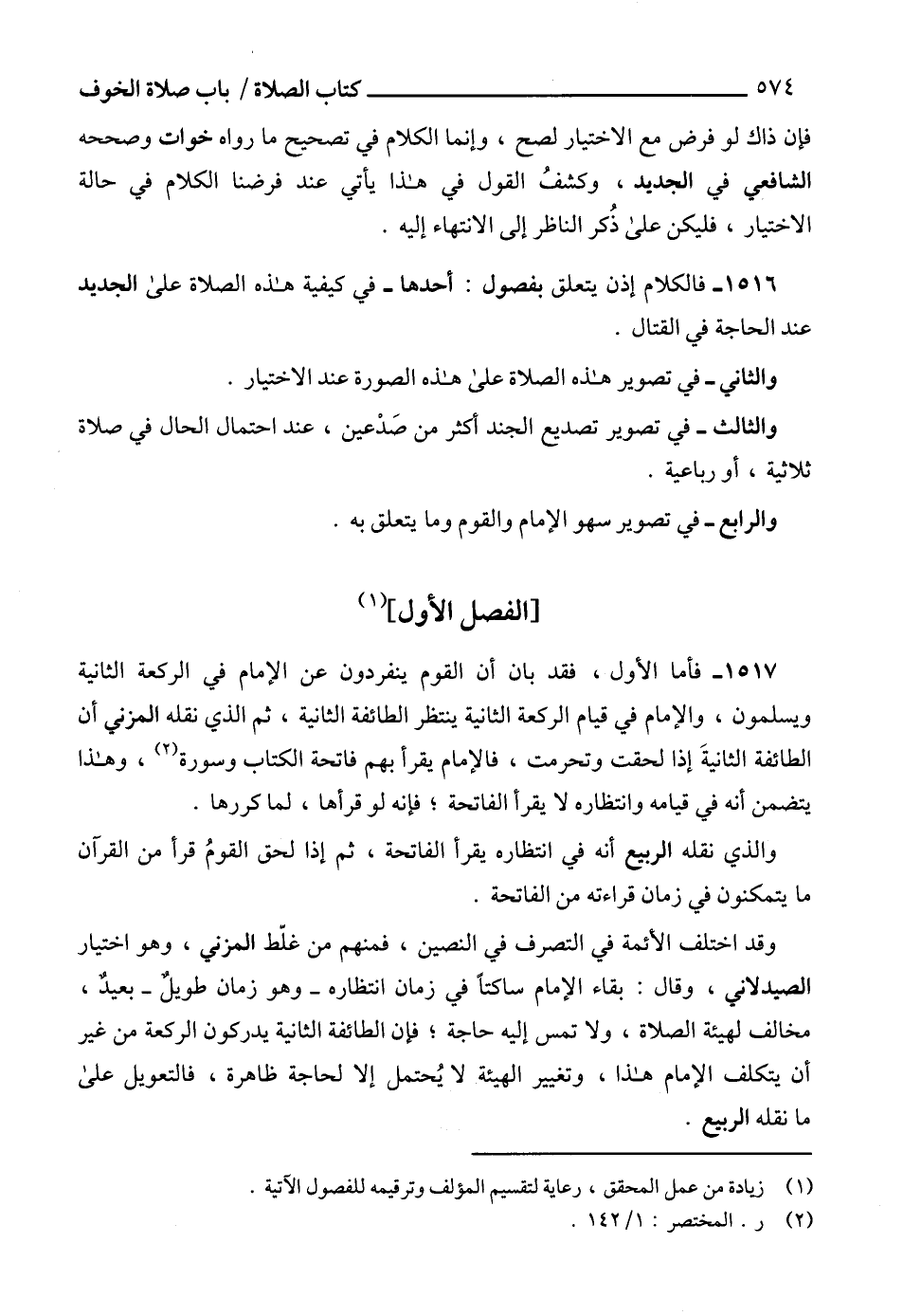 1516 - فالكلام إذن يتعلق بفصول: أحدها - في كيفية هذه الصلاة على الجديد عند الحاجة في القتال.