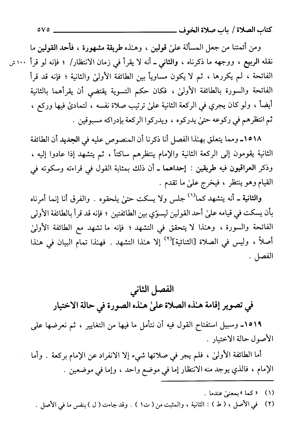 1518 - ومما يتعلق بهذا الفصل أنا ذكرنا أن المنصوص عليه في الجديد أن الطائفة الثانية يقومون إلى الركعة الثانية والإمام ينتظرهم ساكتاً، ثم يتشهد إذا عادوا إليه، وذكر العراقيون فيه طريقين: إحداهما - أن ذلك بمثابة القول في قراءته وسكوته في القيام وهو ينتظر، فيخرج على ما تقدم.
