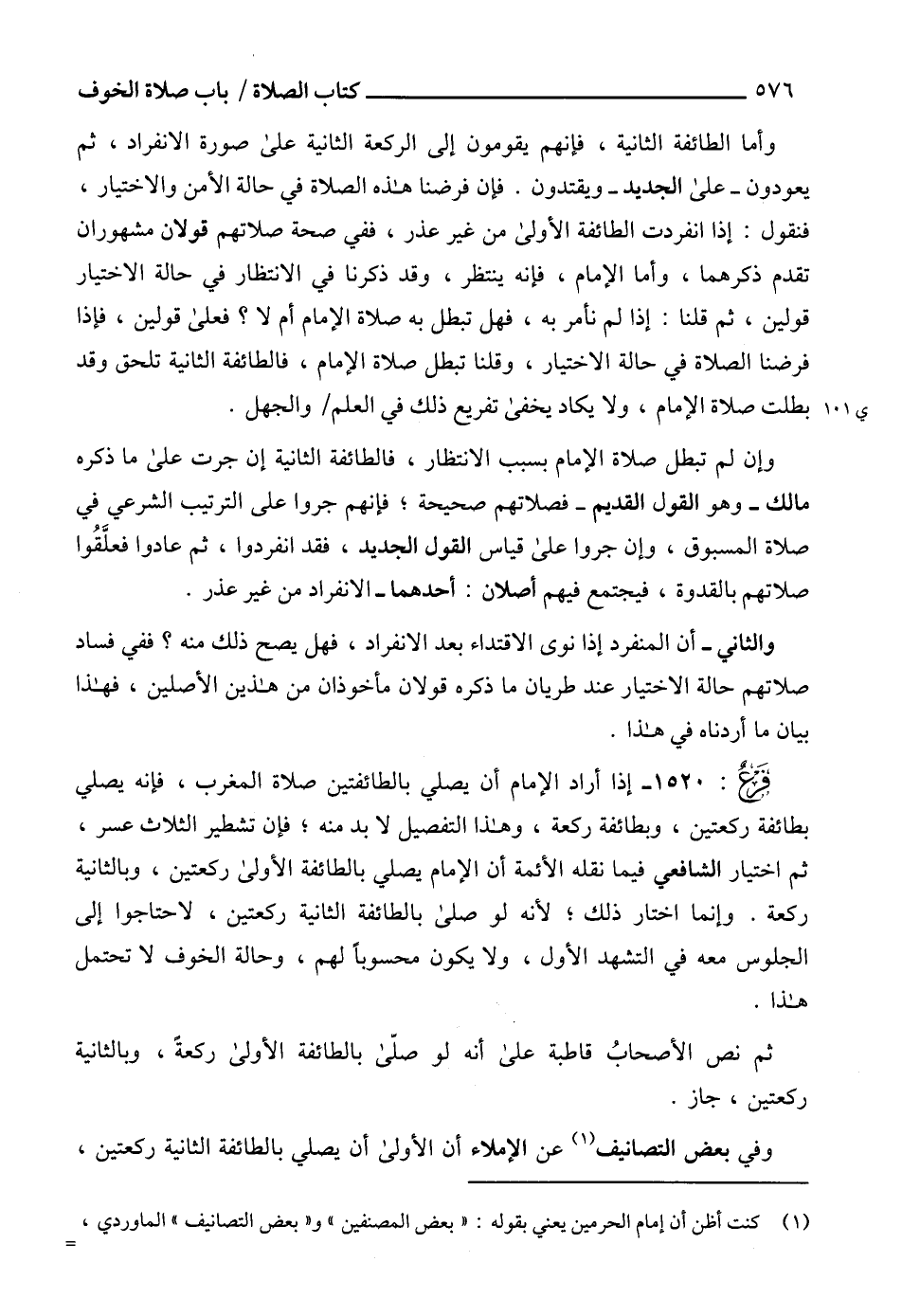 1520 - إذا أراد الإمام أن يصلي بالطائفتين صلاة المغرب؛ فإنه يصلي بطائفة ركعتين، وبطائفة ركعة، وهذا التفصيل لا بد منه؛ فإن تشطير الثلاث عسر، ثم اختيار الشافعي فيما نقله الأئمة أن الإمام يصلي بالطائفة الأولى ركعتين، وبالثانية ركعة. وإنما اختار ذلك؛ لأنه لو صلى بالطائفة الثانية ركعتين، لاحتاجوا إلى الجلوس معه في التشهد الأول، ولا يكون محسوباً لهم، وحالة الخوف لا تحتمل هذا.