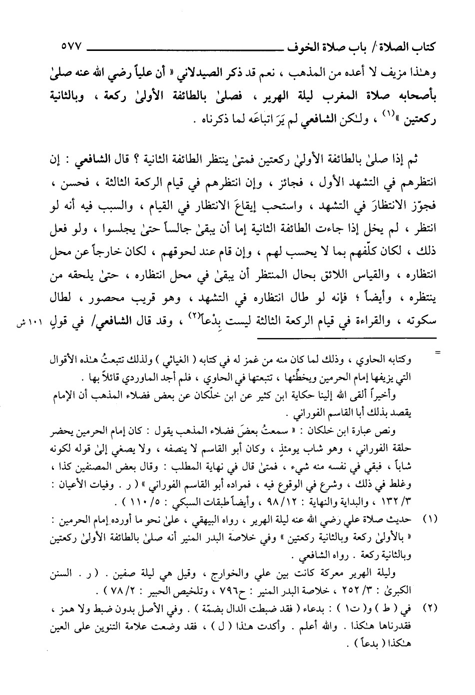 (1) حديث صلاة علي رضي الله عنه ليلة الهرير، رواه البيهقي، على نحو ما أورده. إمام الحرمين: "بالأولى ركعة وبالثانية ركعتين" وفي خلاصة البدر المنير أنه صلى بالطائفة الأولى ركعتين وبالثانية ركعة. رواه الشافعي.