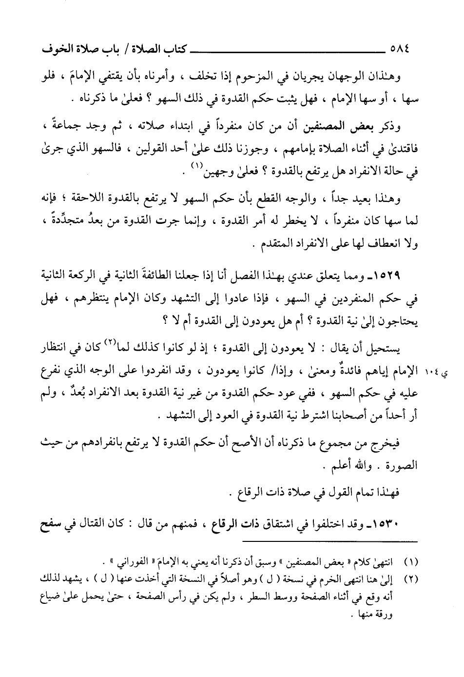 1529 - ومما يتعلق عندي بهذا الفصل أنا إذا جعلنا الطائفةَ الثانية في الركعة الثانية في حكم المنفردين في السهو، فإذا عادوا إلى التشهد وكان الإمام ينتظرهم، فهل يحتاجون إلى نية القدوة؟ أم هل يعودون إلى القدوة أم لا؟