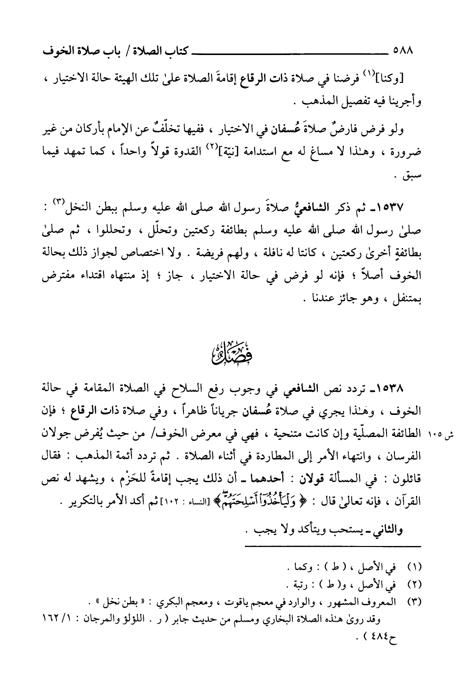 1538 - تردد نص الشافعي في وجوب رفع السلاح في الصلاة المقامة في حالة الخوف، وهذا يجري في صلاة عُسفان جرياناً ظاهراً، وفي صلاة ذات الرقاع؛ فإن الطائفة المصلّية وإن كانت متنحية، فهي في معرض الخوف من حيث يُفرض جولان الفرسان، وانتهاء الأمر إلى المطاردة في أثناء الصلاة. ثم تردد أئمة المذهب: فقال قائلون: في المسألة قولان: أحدهما - أن ذلك يجب إقامةً للحَزْم، ويشهد له نص القرآن؛ فإنه تعالى قال: {وَلْيَأْخُذُوا أَسْلِحَتَهُمْ} [النساء: 102] ثم أكد الأمر بالتكرير.