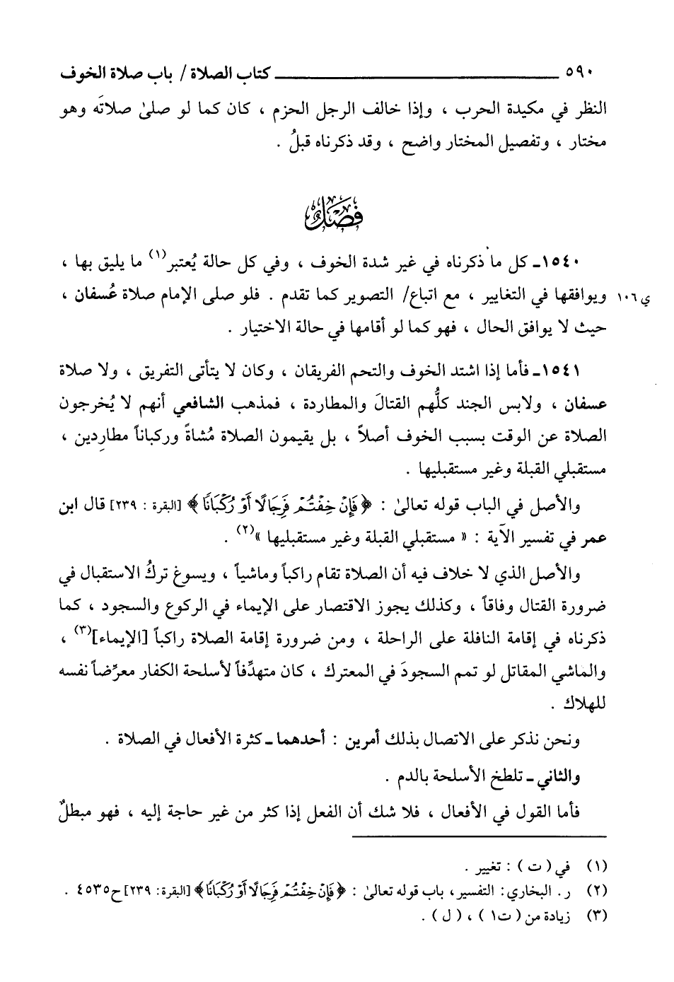 1540 - كل ما ذكرناه في غير شدة الخوف، وفي كل حالة يُعتبر (1) ما يليق بها، ويوافقها في التغايير، مع اتباع التصوير كما تقدم. فلو صلى الإمام صلاة عُسفان، حيث لا يوافق الحال، فهو كما لو أقامها في حالة الاختيار.