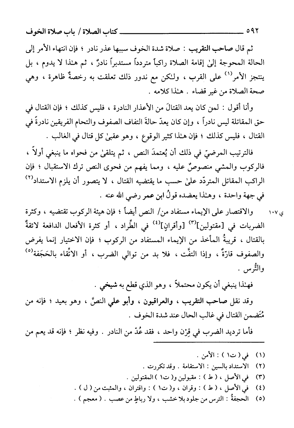 وقد نقل صاحب التقريب، والعراقيون، وأبو علي النصَّ، وهو بعيد؛ فإنه من مُتَضمن القتال في غالب الحال عند شدة الخوف.